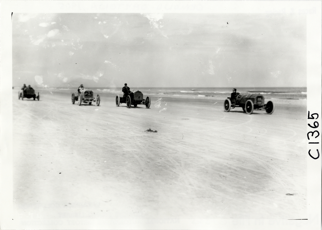 View of four cars, including car no. 25 and car no. 6, racing on beach during the 1905 Ormond-Daytona races in Florida. Handwritten on back: "Races and racing--Ormond-Daytona, 1905."