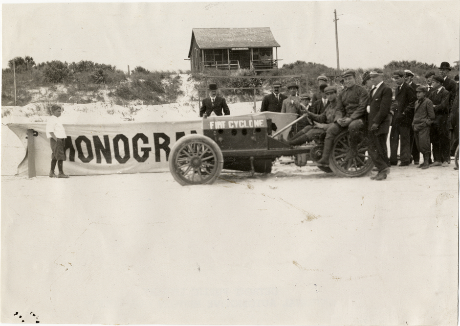 View of George Robertson and group of men posing with driver in Fiat Cyclone car next to Monogram oils banner on beach during the 1908 Ormond-Daytona races in Florida. Onlookers stand nearby; wooden-frame house with "The Hermitage" sign in background. Handwritten on back: "Races and racing--Ormond-Daytona, 1908."