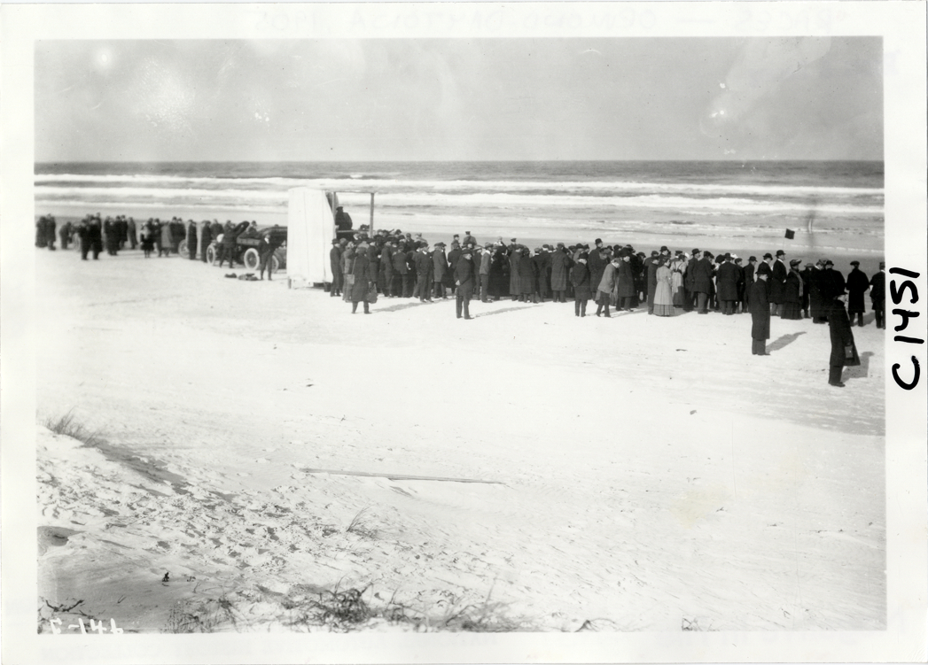 View of spectators on beach during the 1905 Ormond-Daytona races in Florida. Handwritten on back: "Races and racing--Ormond-Daytona, 1905."