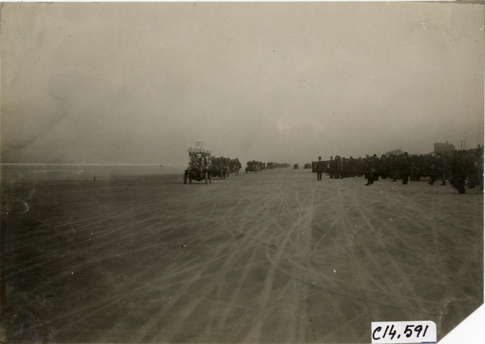 View of automobile parade on beach during the 1906 Ormond-Daytona races in Florida. Lead car is decorated; cars travel in single file. Stamped on back: "Photo by N. Lazarnick, 29 West 42nd Street, New York." Handwritten on back: "Races and racing--Ormond-Daytona, 1906."
