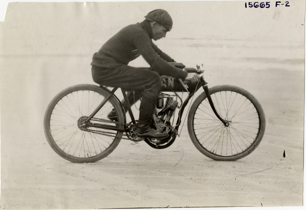 Robert Stubbs on Indian motorcycle, 1908 Ormond-Daytona races