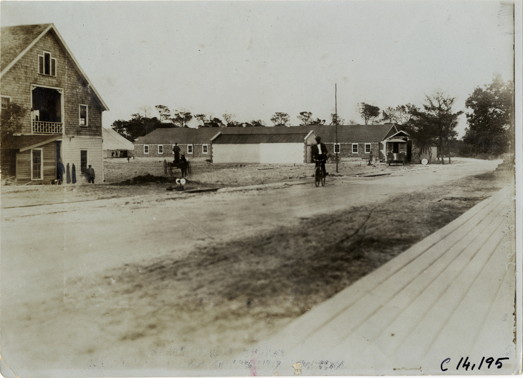 Man riding bicycle past buildings, 1905 Ormond-Daytona races