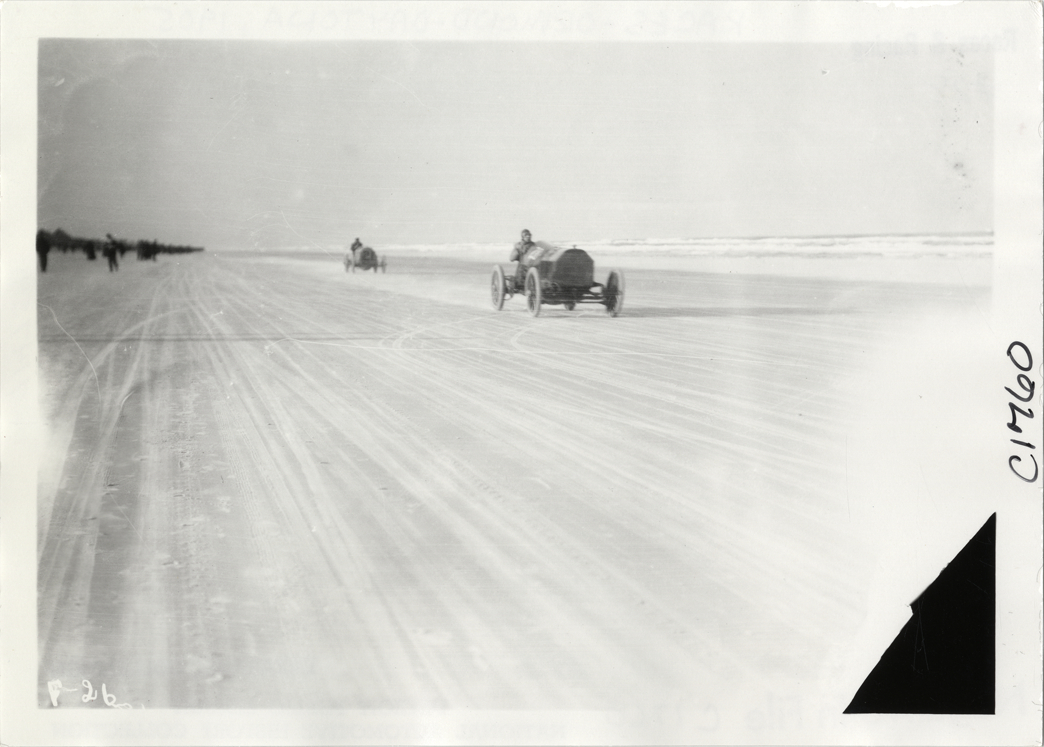 View of car no. 28 and car no. 21 racing on beach during the 1905 Ormond-Daytona races in Florida. Handwritten on back: "Races and racing--Ormond-Daytona, 1905."