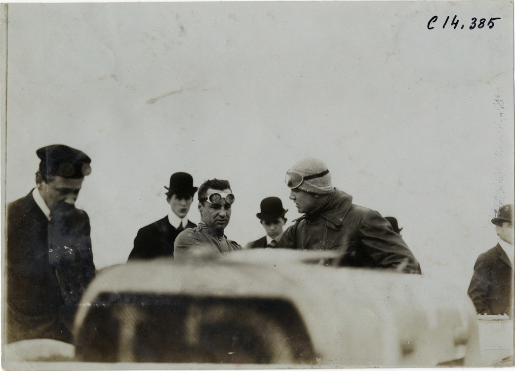 Frank Croker speaking with man next to Simplex racecar, 1905 Ormond-Daytona races