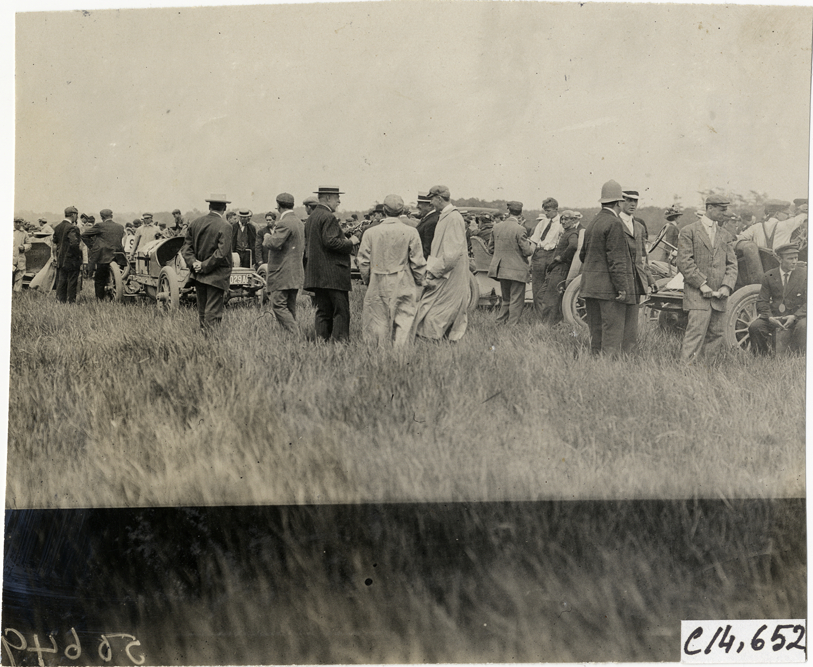 View of spectators and cars on roadside during the 1909 races at the Readville racetrack in Boston, Massachusetts. Handwritten on back: "Races and racing--Readville races, 1909."