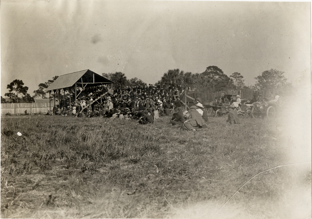 View of spectators in bleachers and grandstand during the 1908 Ormond-Daytona races in Florida. Stamped on back: "Spooner & Wells, Inc., photographers, telephones 3472-3473 Columbus, 1931 Broadway, New York." Handwritten on back: "Races and racing--Ormond-Daytona, 1908."