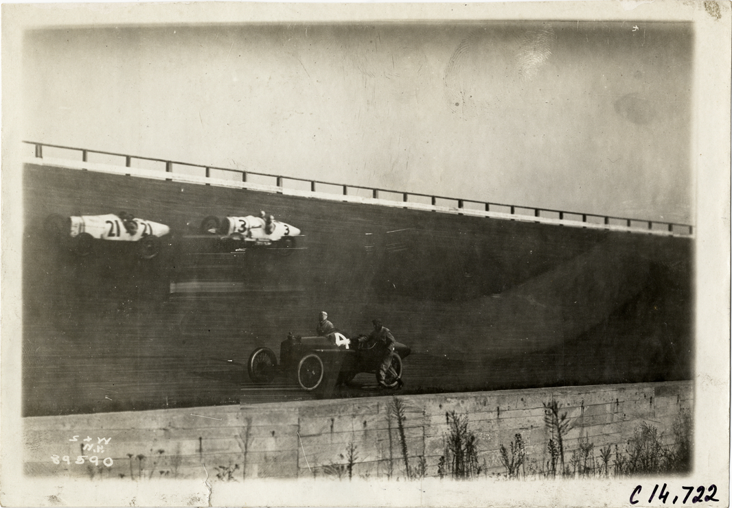 View of cars no. 21, no. 3 and no. 4 racing on track during the 1915 races at Sheepshead Bay Speedway in Brooklyn, New York. Printed on front: "S & W, N.Y." Handwritten on back: "Races and racing--Sheepshead Bay races, 1915."