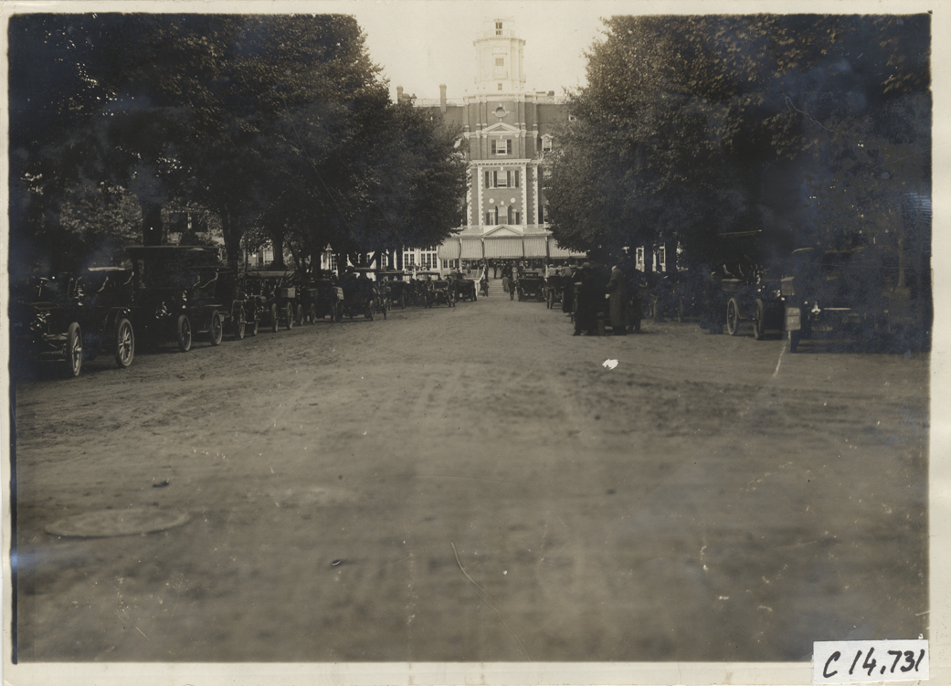 View of the Garden City Hotel during the 1904 Vanderbilt Cup races on Long Island, New York. Cars are parked on both sides of street. Handwritten on back: "Headquarters at Garden City. Races and racing--Vanderbilt Cup races, 1904."