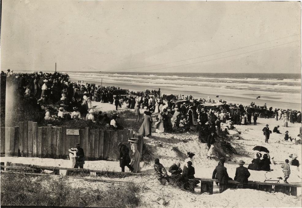 View of spectators, some with cars, on beach during the 1908 Ormond-Daytona races in Florida. Stamped on back: "Spooner & Wells, Inc., photographers, telephones 3472-3473 Columbus, 1931 Broadway, New York." Handwritten on back: "Races and racing--Ormond-Daytona, 1908."