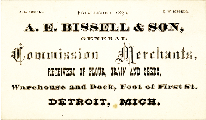 View of a business card for A.E. Bissell & Son. Printed on front: "A.E. Bissell & Son, general commission merchants, receivers of flour, grain and seeds, warehouse and dock, foot of First St., Detroit, Mich. Established 1839. A.E. Bissell, E.W. Bissell."