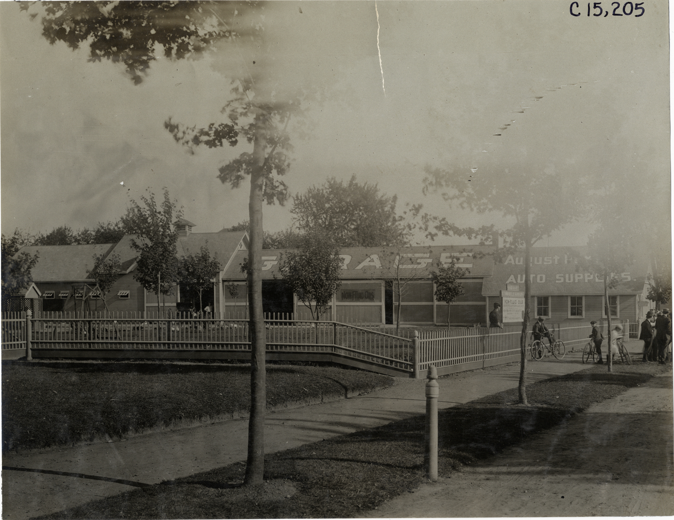 View of August Porrier's garage, site of Fiat headquarters, during the 1906 Vanderbilt Cup races on Long Island, New York. Bicyclists on sidewalk; "August Porrier's garage, auto supplies" painted on roof of one-story wooden-frame building. Handwritten on back: "Elimination, Fiat HQ. Races and racing--Vanderbilt Cup races, 1906."