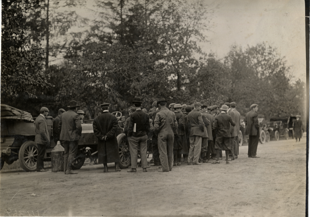 View of spectators surrounding car on roadside during the 1908 Vanderbilt Cup races on Long Island, New York. Handwritten on back: "Races and racing--Vanderbilt Cup races, 1908."