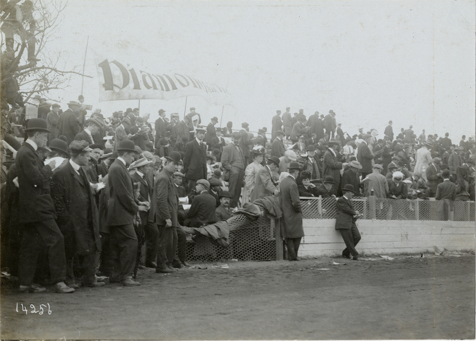 View of spectators in grandstand during the 1906 Vanderbilt Cup races on Long Island, New York. Diamond tires banner is displayed on left. Stamped on back: "Photo by N. Lazarnick, 29 West 42nd Street, New York." Handwritten on back: "Races and racing--Vanderbilt Cup races, 1906."