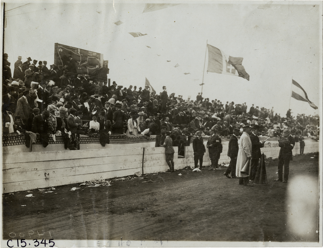 View of spectators in grandstand during the 1906 Vanderbilt Cup races on Long Island, New York. Handwritten on back: "Races and racing--Vanderbilt Cup races, 1906."