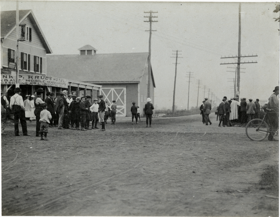 Spectators standing in front of Krug's Hotel, 1906 Vanderbilt Cup races