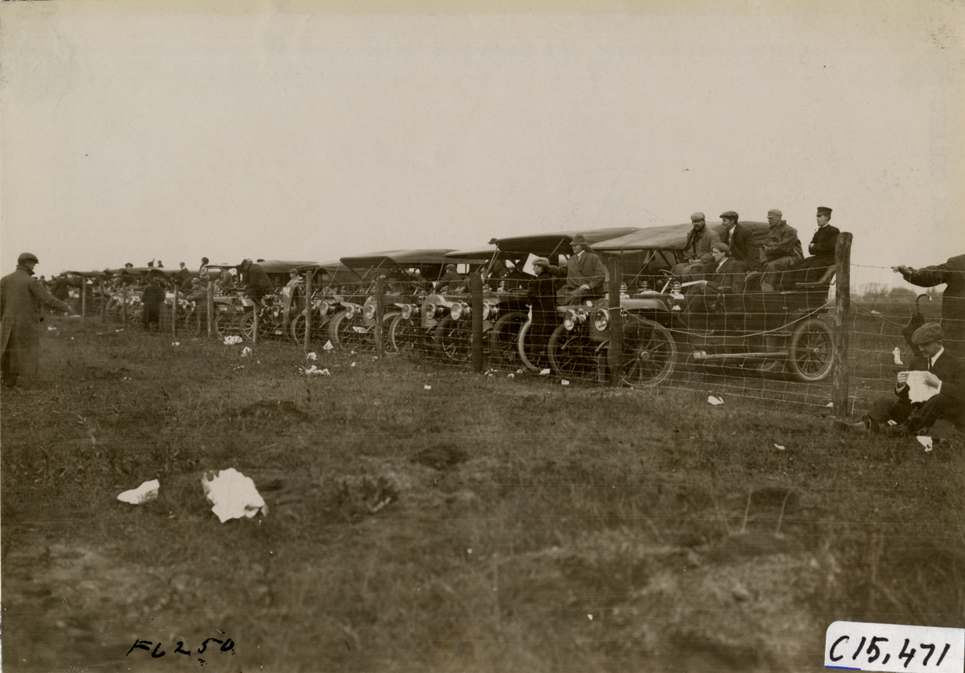 View of spectators with cars parked behind fence on roadside during the 1908 Vanderbilt Cup races on Long Island, New York. Handwritten on back: "Races and racing--Vanderbilt Cup races, 1908."