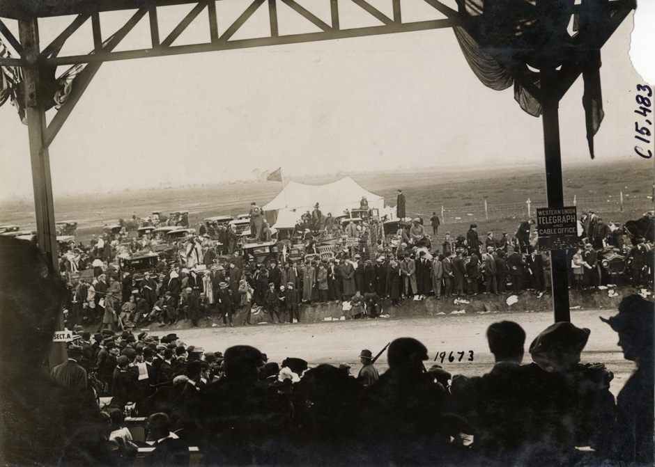 View from grandstand of spectators, cars and tent during the 1908 Vanderbilt Cup races on Long Island, New York. "Western Union Telegraph and Cable office" sign displayed inside grandstand. Stamped on back: "Photo by N. Lazarnick, 29 West 42nd Street, N.Y., tel. 594 Bryant." Handwritten on back: "Races and racing--Vanderbilt Cup races, 1908."