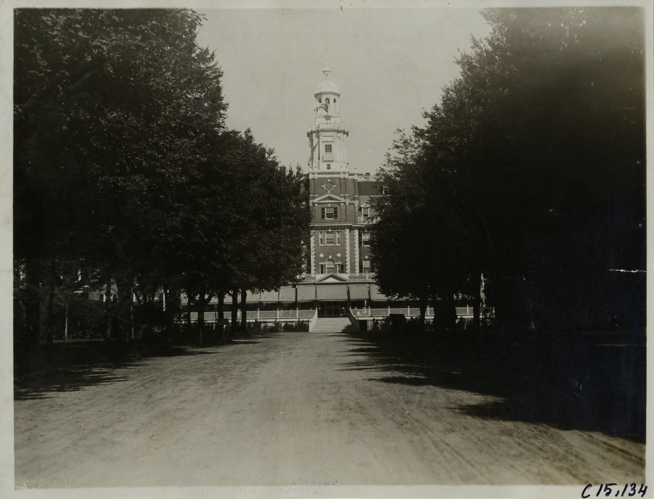 View of Garden City Hotel during the 1905 Vanderbilt Cup races on Long Island, New York. Handwritten on back: "Headquarters. Races and racing--Vanderbilt Cup races, 1905."
