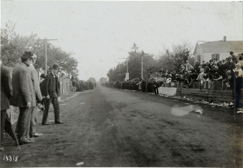 View of spectators on roadside during the 1906 Vanderbilt Cup races on Long Island, New York. Stamped on back: "Photo by N. Lazarnick, 29 West 42nd Street, New York." Handwritten on back: "Races and racing--Vanderbilt Cup races, 1906."