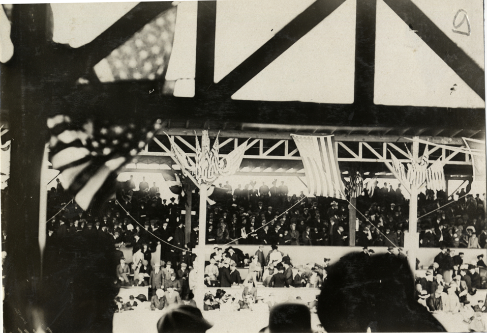 View of spectators in grandstand during the 1908 Vanderbilt Cup races on Long Island, New York. Stamped on back: "Spooner & Wells, Inc., photographers, telephones 3472-3473 Columbus, 1931 Broadway, New York." Handwritten on back: "Races and racing--Vanderbilt Cup races, 1908."