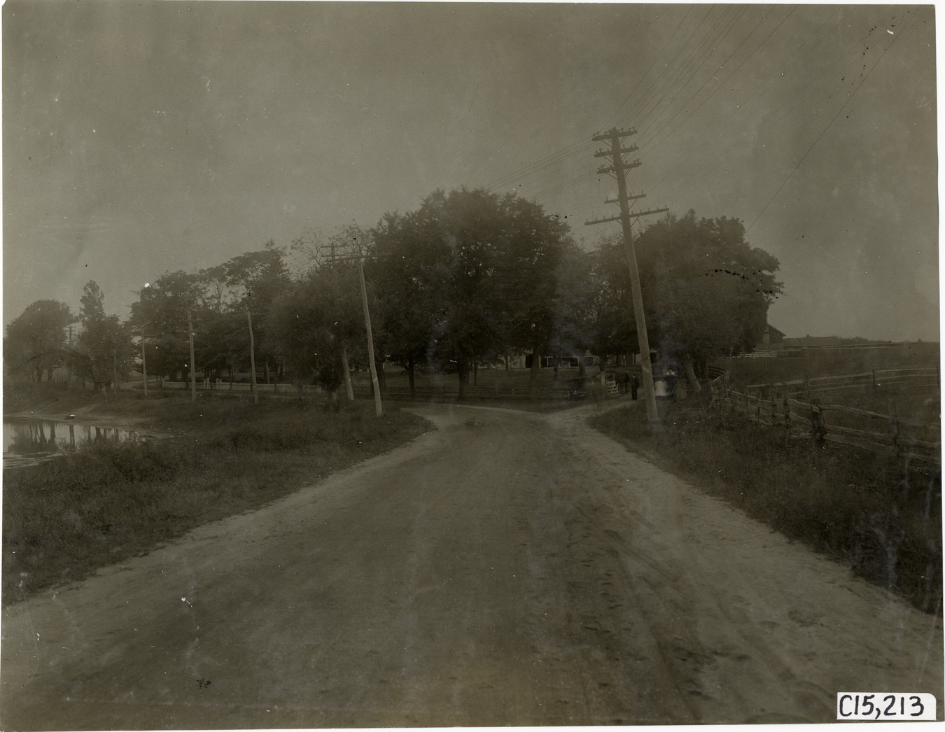 View of rural dirt road, part of the course for the 1906 Vanderbilt Cup races on Long Island, New York. House and farm buildings are obscured by trees. Handwritten on back: "Elimination. Races and racing--Vanderbilt Cup races, 1906."