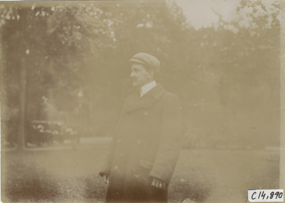 View of man, wearing cap and overcoat, at the 1904 Vanderbilt Cup races on Long Island, New York. Handwritten on back: "Races and racing--Vanderbilt Cup races, 1904."