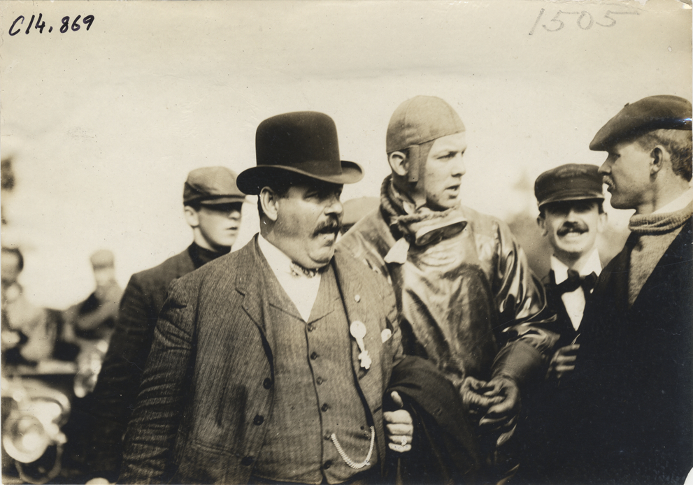 View of driver Frank Croker, racing official and two unidentified men during the 1904 Vanderbilt Cup races on Long Island, New York. Handwritten on back: "Frank Croker. Races and racing--Vanderbilt Cup races, 1904."