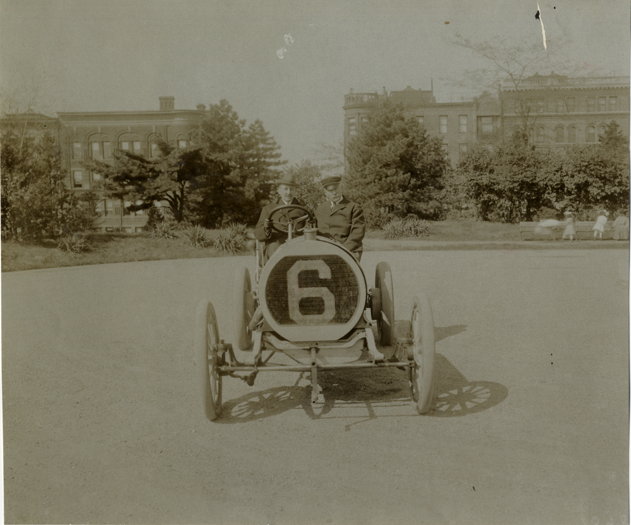 Front view of chairman Jefferson De Mont Thompson (in passenger seat) and unidentified man posing in car no. 6 during the 1908 Vanderbilt Cup races on Long Island, New York. Stamped on back: "Photo by Spooner and Wells, 1536 Broadway, New York. Duplicates any time, any quantities, enlargements any size this plate." Handwritten on back: "Races and racing--Vanderbilt Cup races, 1908."
