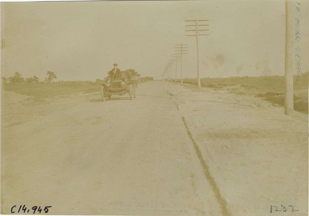 View of motorist in car traveling on rural dirt road, part of the course for the 1904 Vanderbilt Cup races on Long Island, New York. Handwritten on back: "Races and racing--Vanderbilt Cup races, 1904."