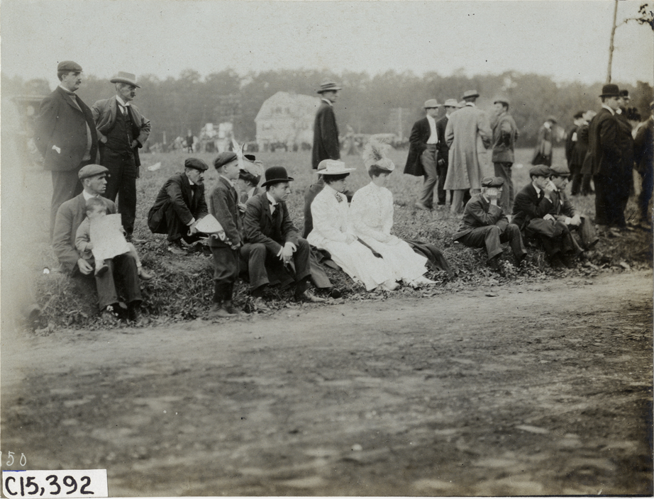 View of spectators on roadside during the 1906 Vanderbilt Cup races on Long Island, New York. Stamped on back: "Photo by N. Lazarnick, 29 West 42nd Street, New York." Handwritten on back: "Races and racing--Vanderbilt Cup races, 1906."