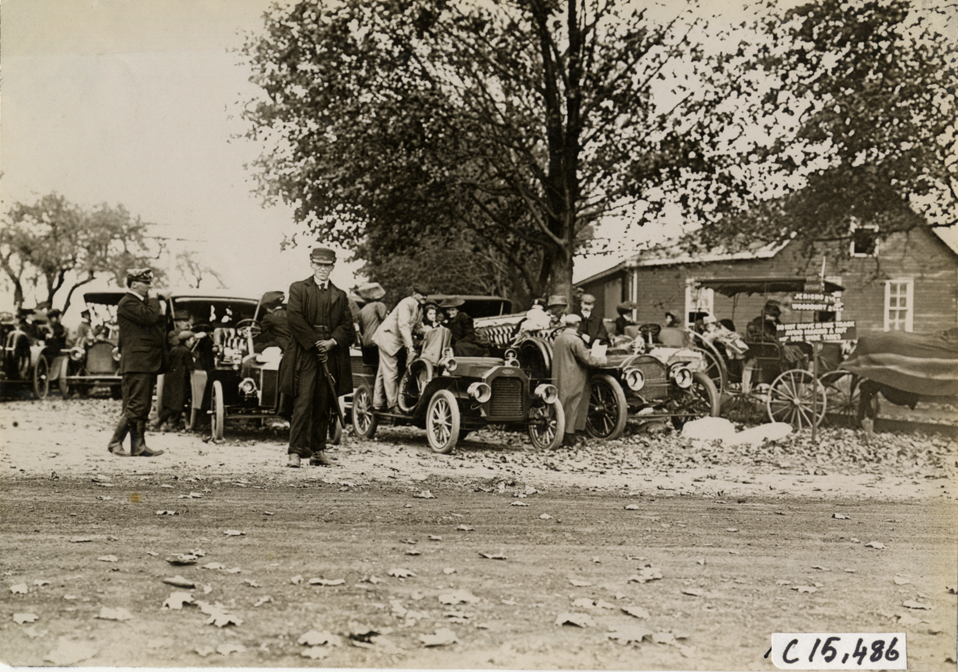 Spectators and automobiles on roadside, 1908 Vanderbilt Cup races