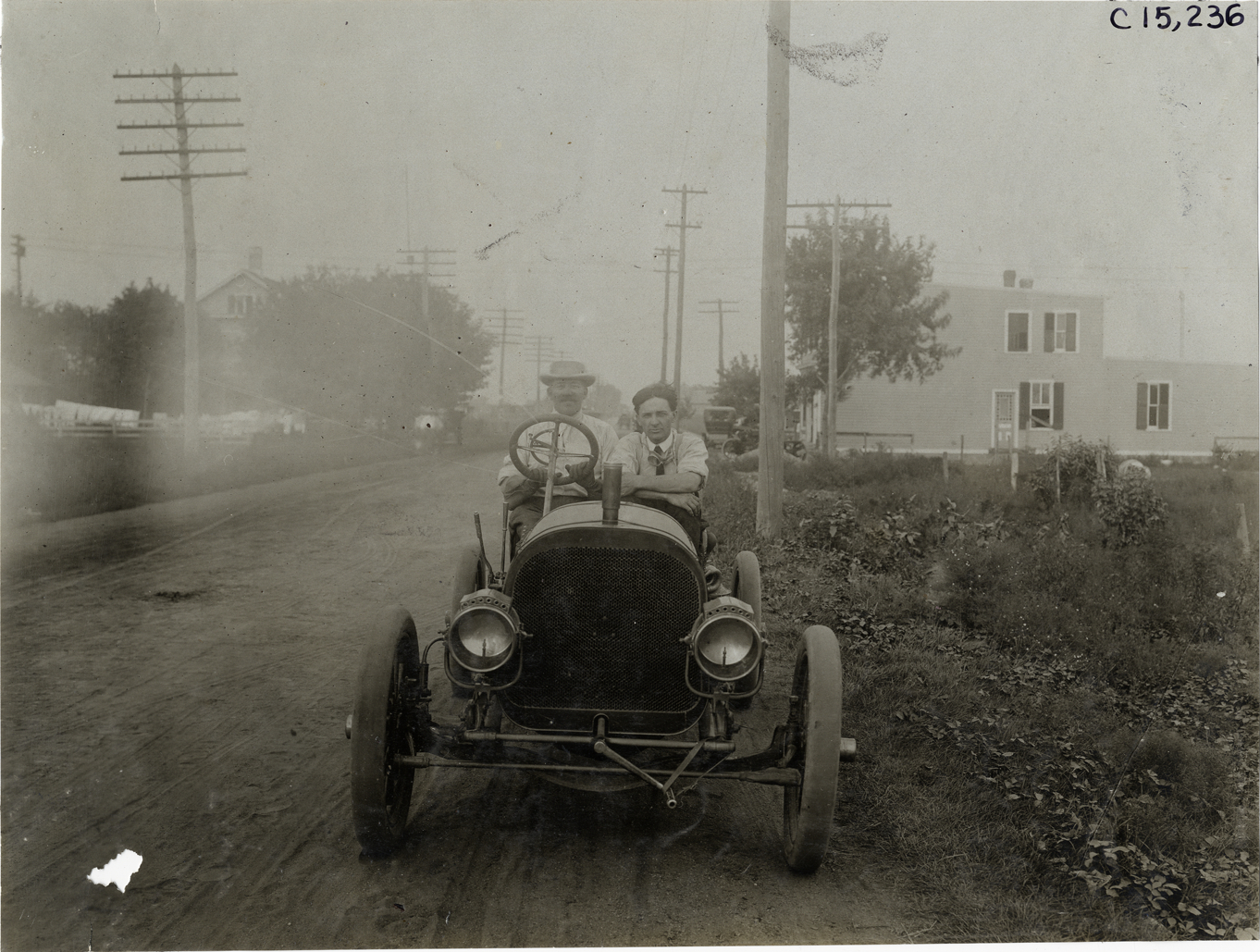 John Haynes and passenger in Haynes racecar, 1906 Vanderbilt Cup races