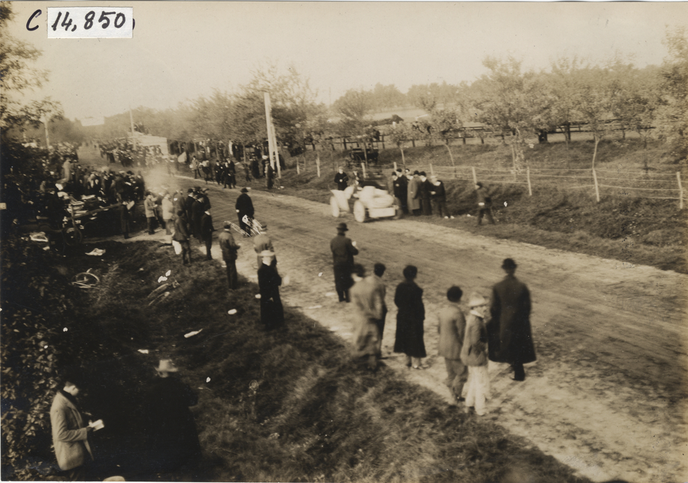 View of spectators on roadside during the 1904 Vanderbilt Cup races on Long Island, New York. Car is parked on roadside. Handwritten on back: "Races and racing--Vanderbilt Cup races, 1904."