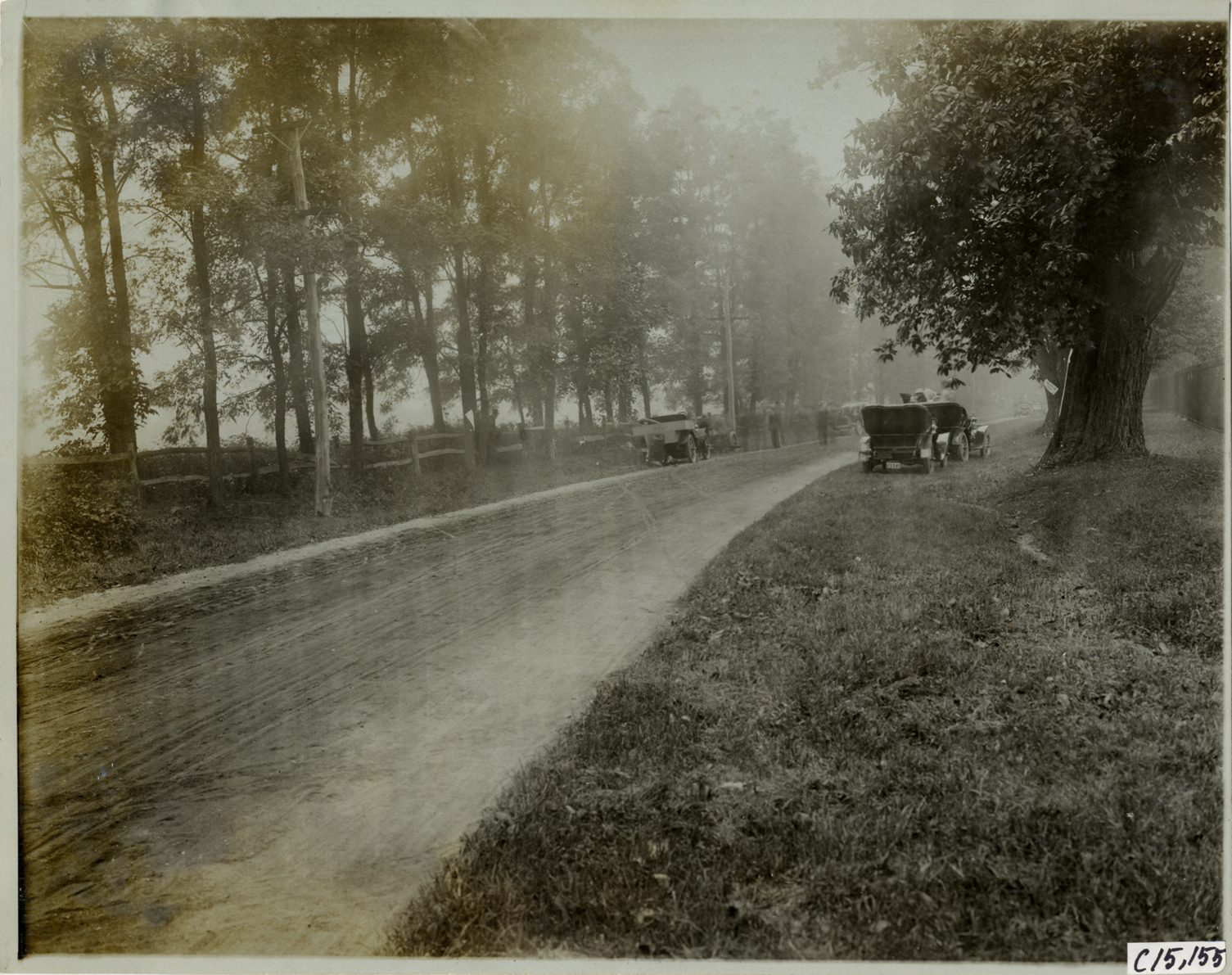 Distant view of accident scene involving Fiat car driven by Louis Chevrolet during the 1905 Vanderbilt Cup races on Long Island, New York. Cars and onlookers are visible along curve of tree-lined dirt road. Stamped on back: "Photo by F. Ed. Spooner, 1536 B'way, telephone 6536-38th St., New York, N.Y." Handwritten on back: "Scene of the wrecked Fiat of Louis Chevrolet. Races and racing--Vanderbilt Cup races, 1905."