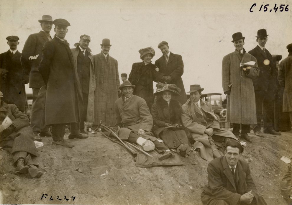 View of men and women on roadside during the 1908 Vanderbilt Cup races on Long Island, New York. Man sitting on blanket has pair of crutches. Handwritten on back: "Races and racing--Vanderbilt Cup races, 1908."