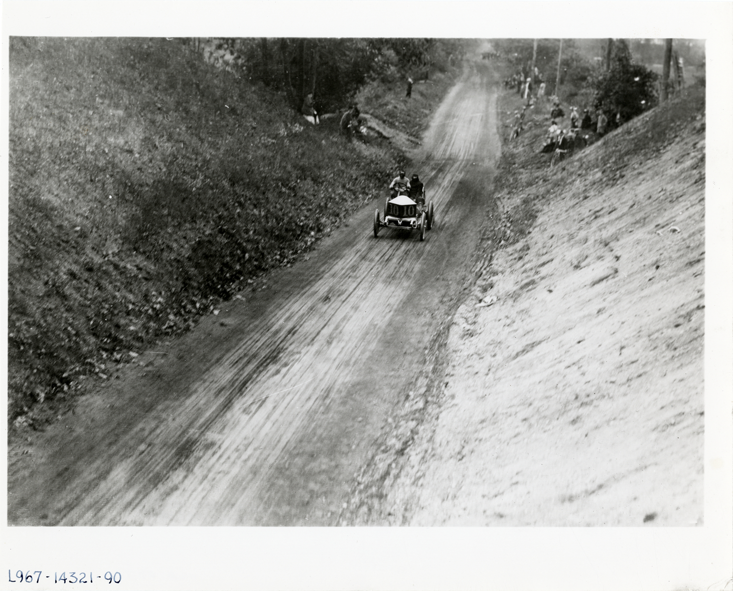 Bird's-eye view of Louis Wagner and passenger racing Darracq car no. 10 during the 1906 Vanderbilt Cup races on Long Island, New York. Spectators watch from roadside. Handwritten on back: "Louis Wagner in a Darracq. Races and racing--Vanderbilt Cup races, 1906."