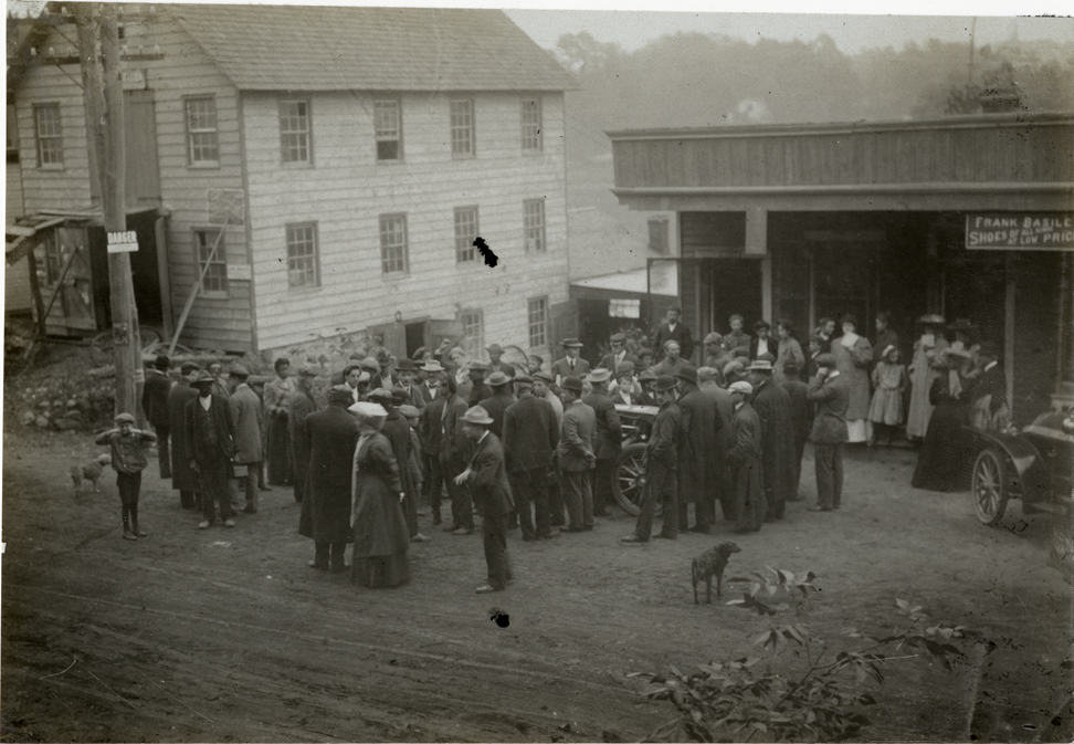 View of crowd surrounding car during the 1906 Vanderbilt Cup races on Long Island, New York. Frank Basile shoe store and wooden-frame building in background. Stamped on back: "Photo by N. Lazarnick, 29 West 42nd Street, New York." Handwritten on back: "Races and racing--Vanderbilt Cup races, 1906."