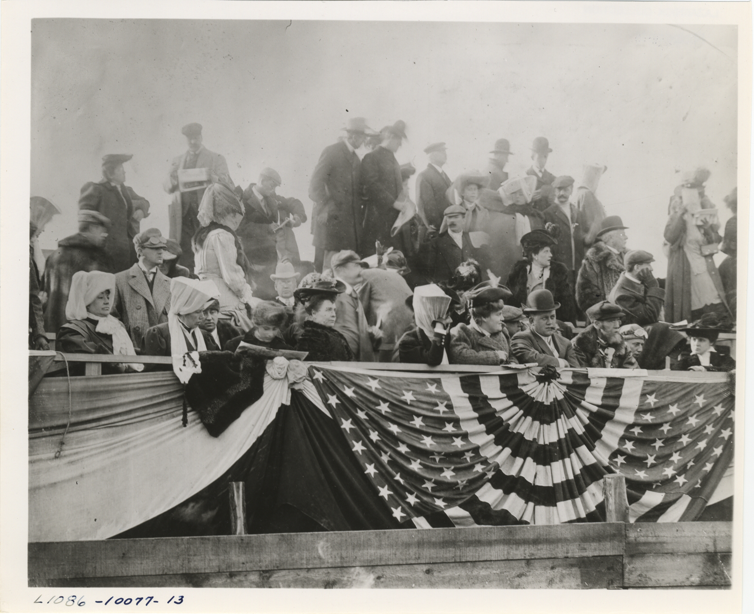 View of men and women in grandstand during the 1905 Vanderbilt Cup races on Long Island, New York. Handwritten on back: "Races and racing--Vanderbilt Cup races, 1905."