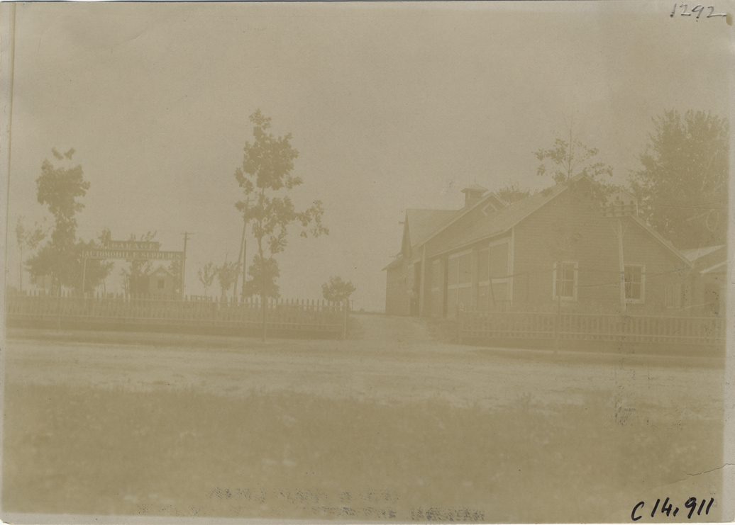 View of wooden-frame garage during the 1904 Vanderbilt Cup races on Long Island, New York. Sign displayed in front of garage reads: "Garage, automobile supplies." Handwritten on back: "Races and racing--Vanderbilt Cup races, 1904."