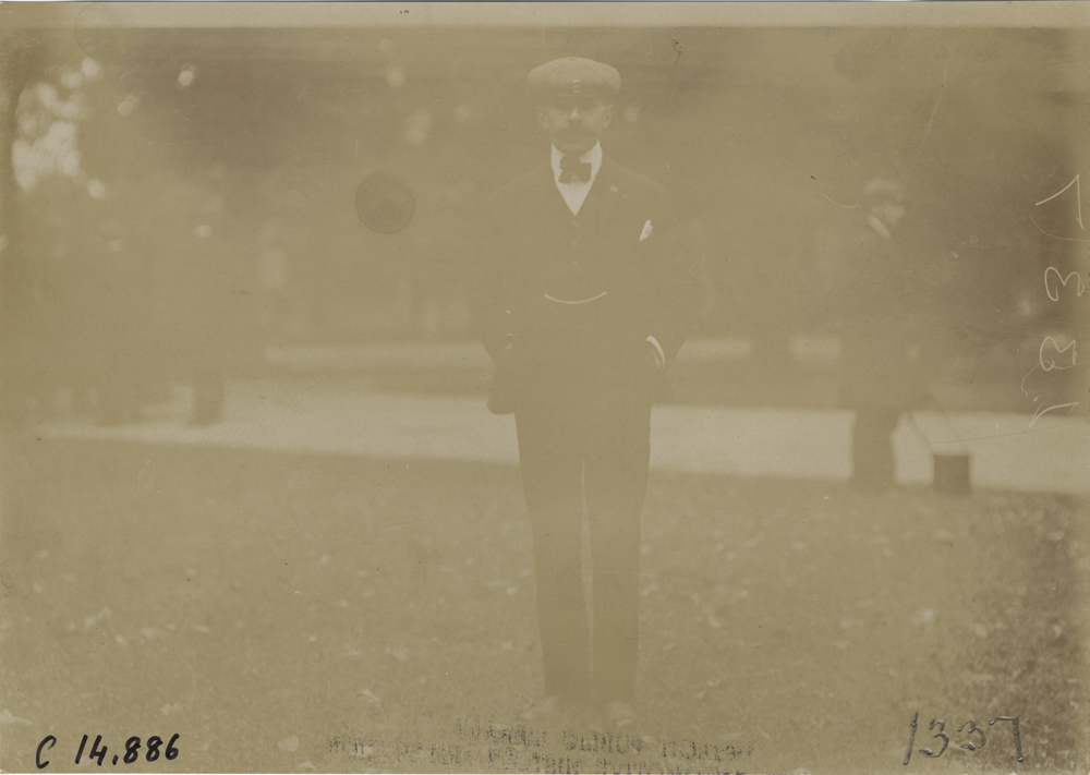 View of man, wearing suit and cap, at the 1904 Vanderbilt Cup races on Long Island, New York. Handwritten on back: "Races and racing--Vanderbilt Cup races, 1904."