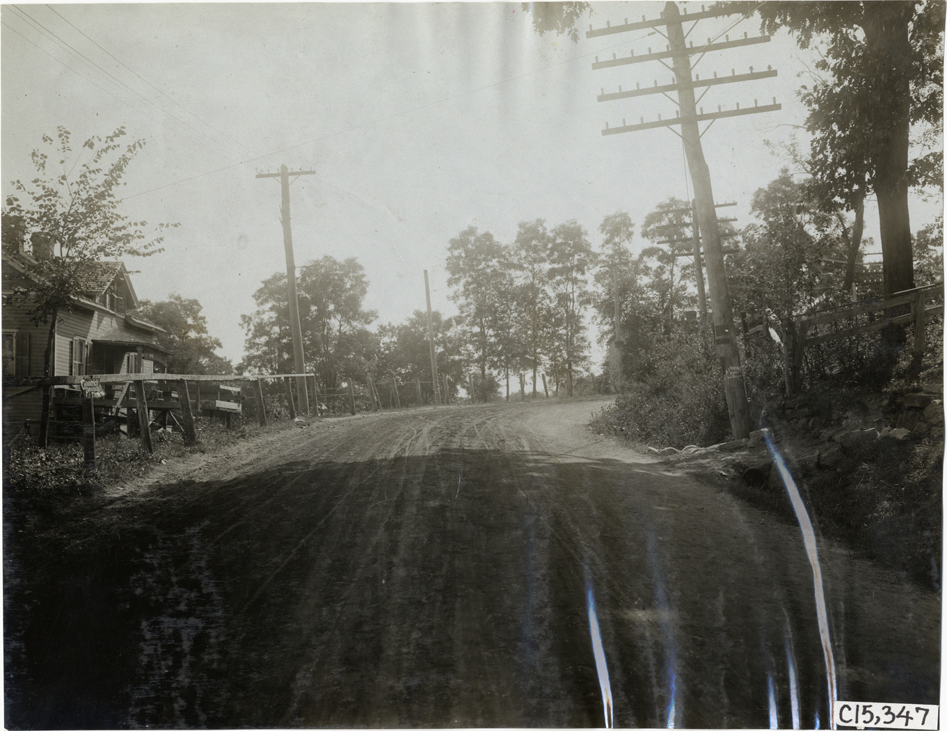 View of rural dirt road, part of the course for the 1906 Vanderbilt Cup races on Long Island, New York. Wooden-frame house on left. Handwritten on back: "Elimination. Races and racing--Vanderbilt Cup races, 1906."