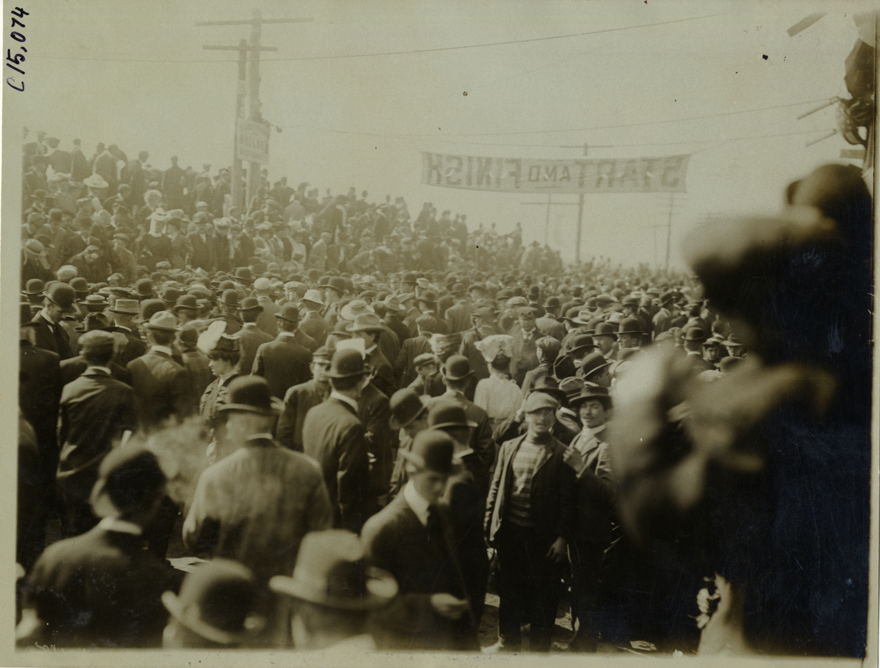 View of crowd of spectators near "Start and finish" banner during the 1905 Vanderbilt Cup races on Long Island, New York. Handwritten on back: "Races and racing--Vanderbilt Cup races, 1905."
