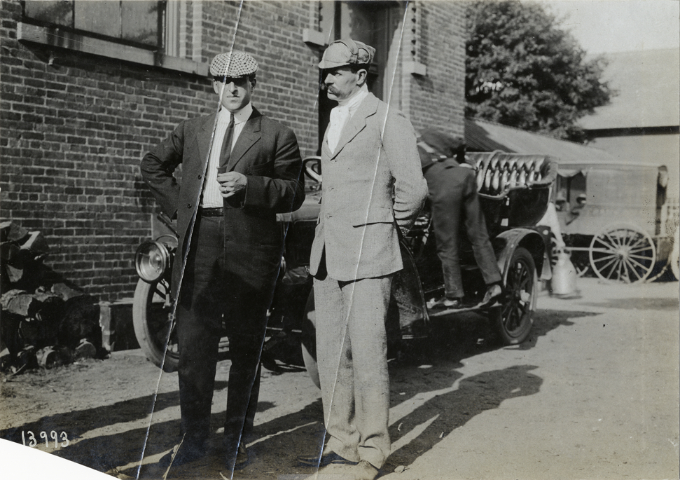 View of George Heath and unidentified man during the 1906 Vanderbilt Cup races on Long Island, New York. Brick building and car in background. Stamped on back: "Photo by N. Lazarnick, 29 West 42nd Street, New York." Handwritten on back: "Heath. Races and racing--Vanderbilt Cup races, 1906."