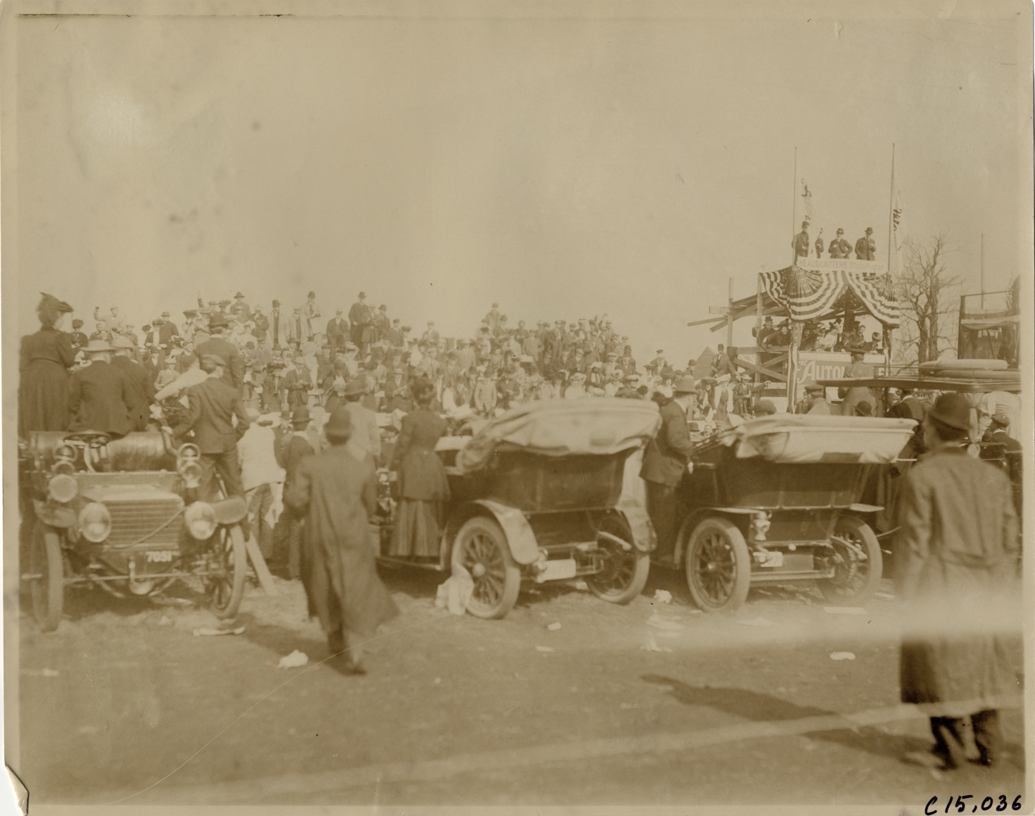 Rear view of spectators and cars on side of course during the 1905 Vanderbilt Cup races on Long Island, New York. Stand decorated with bunting, flags and "Headquarters, official program" sign in background. Stamped on back: "Photo by F. Ed. Spooner, 1536 B'way, telephone 6536-38th St., New York, N.Y." Handwritten on back: "Races and racing--Vanderbilt Cup races, 1905."