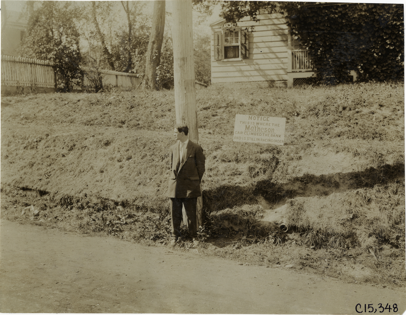View of man standing in front of utility pole during the 1906 Vanderbilt Cup races on Long Island, New York. Sign on roadside reads: "Notice. This is where the Matheson car climbed the bank and is still in racing order." House in background. Handwritten on back: "Elimination. Races and racing--Vanderbilt Cup races, 1906."