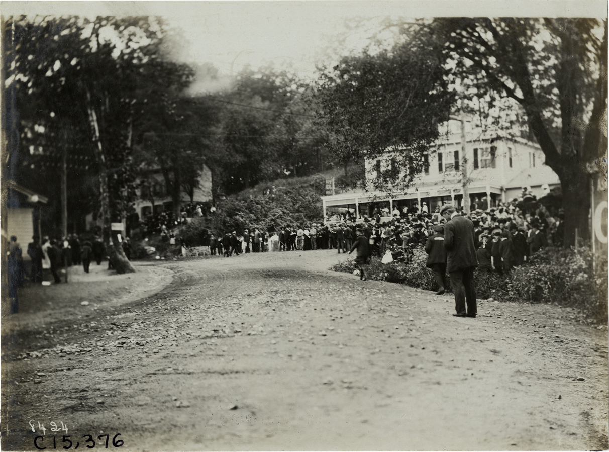 View of spectators on roadside during the 1906 Vanderbilt Cup races on Long Island, New York. Hotel in background. Handwritten on back: "Races and racing--Vanderbilt Cup races, 1906."