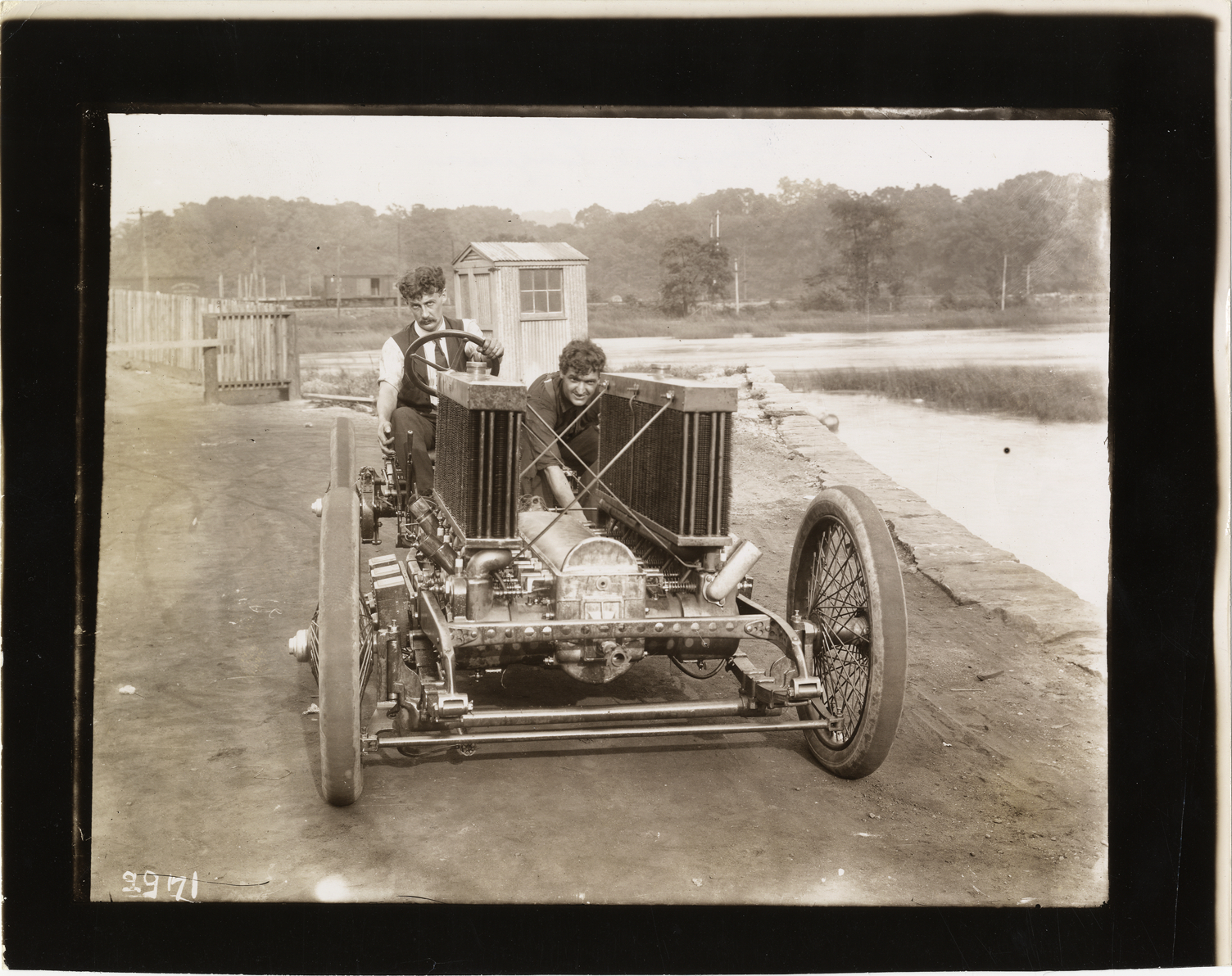 View of J.D. Maxwell and passenger posing in Maxwell car that was constructed with two radiators during the 1906 Vanderbilt Cup races on Long Island, New York. Stamped on back: "Photographic illustration by Nick Lazarnick, 230 Park Ave., N.Y." Handwritten on back: "Racer with horizontal engines, 2 radiators for cooling, Maxwell at wheel. Races and racing--Vanderbilt Cup races, 1906."