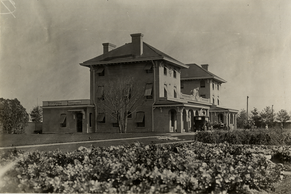 Side and front view of Robert Graves' garage and hotel during the 1908 Vanderbilt Cup races on Long Island, New York. Handwritten on back: "Robert Graves' garage, Minneola [sic], L.I. Races and racing--Vanderbilt Cup races, 1908."