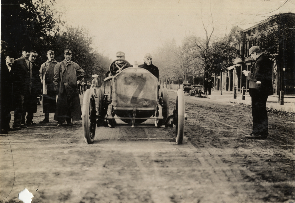 James B. Ryall and passenger in Matheson racecar, 1908 Vanderbilt Cup races