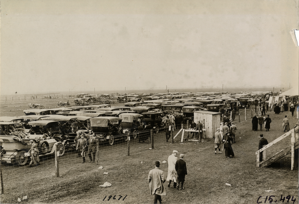 Automobiles parked in field, 1908 Vanderbilt Cup races